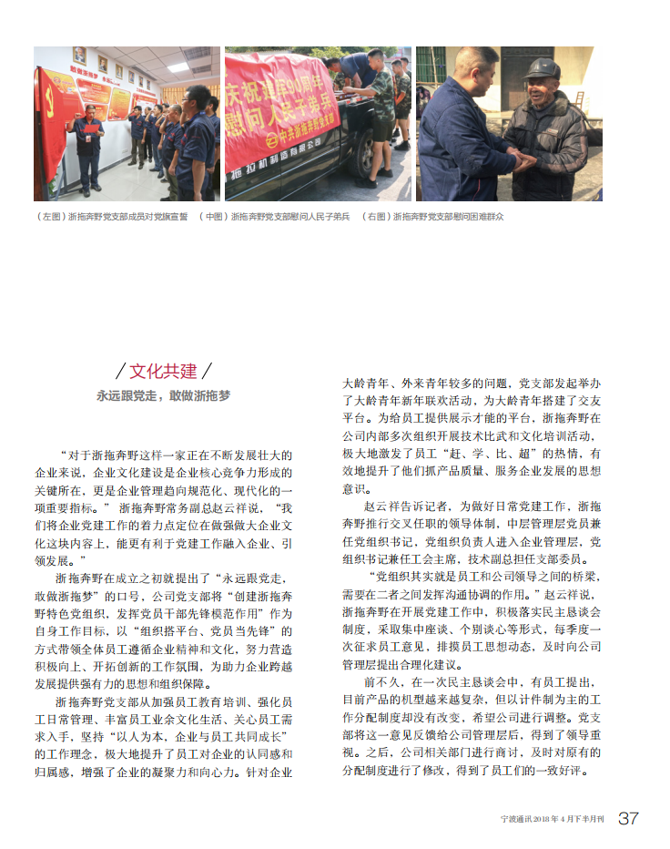 中共浙拖奔野黨組織在步入新時代、走向新起點、踏上新征程的道路上,充分發(fā)揮一名黨員一面旗幟的作用,為企業(yè)的發(fā)展和騰飛作出奉獻。