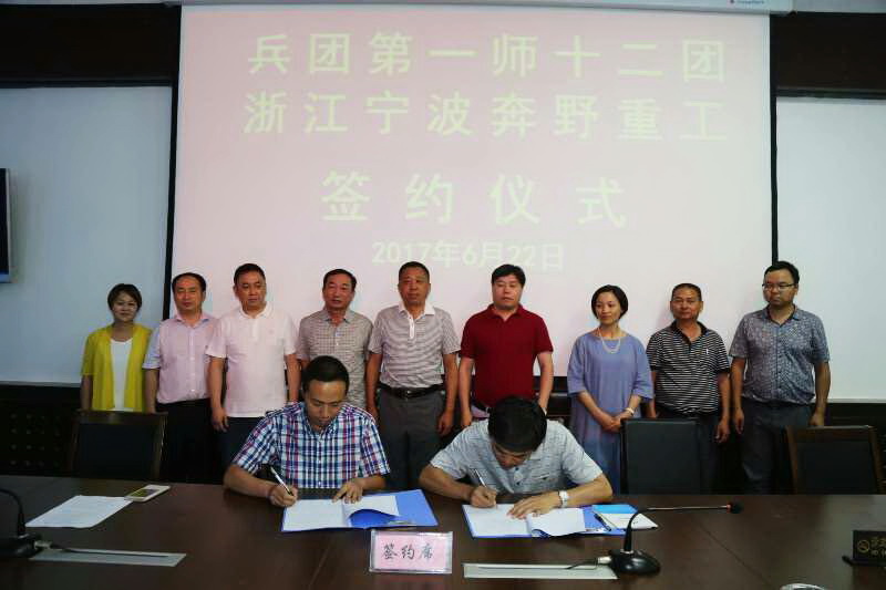 6月22日,寧波奔野重工董事長王興洪等公司領(lǐng)導(dǎo)在新疆出席兵團一師十二團項目合作簽約儀式。