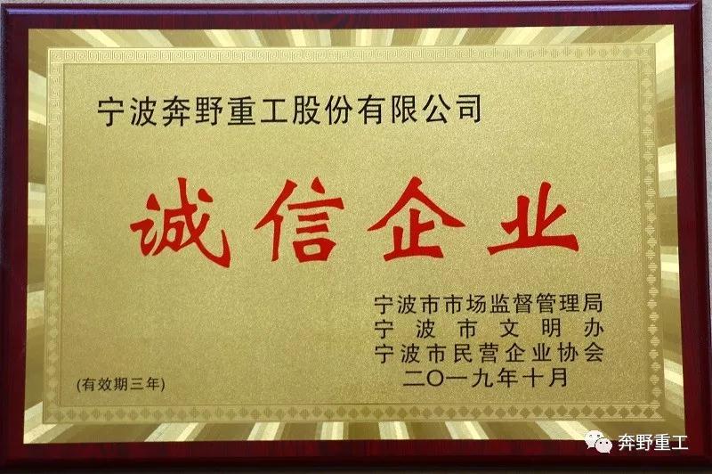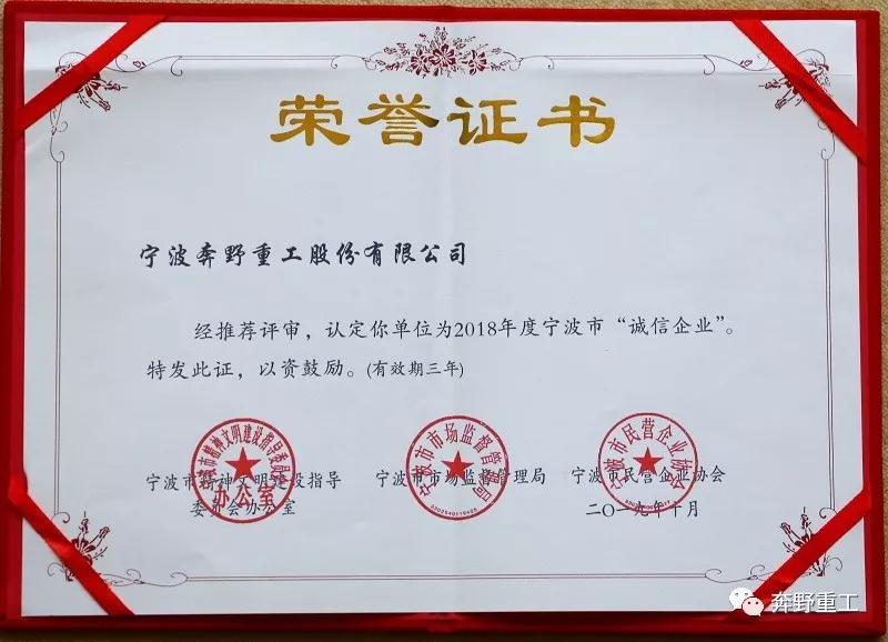企業(yè)誠信,作為企業(yè)文化的重要組成部分,孕育于企業(yè)文化,扎根并滲透于企業(yè)文化,是企業(yè)文化不可或缺的重要組成部分。由寧波市市場(chǎng)監(jiān)督管理局、寧波市文明辦、寧波市民營企業(yè)協(xié)會(huì)共同推薦評(píng)審,寧波奔野重工股份有限公司認(rèn)定為2018年度寧波市“誠信企業(yè)”。
