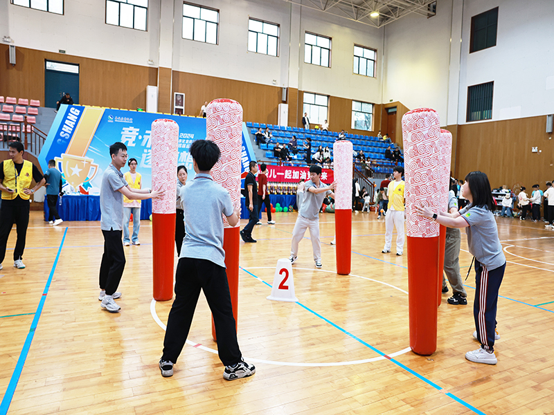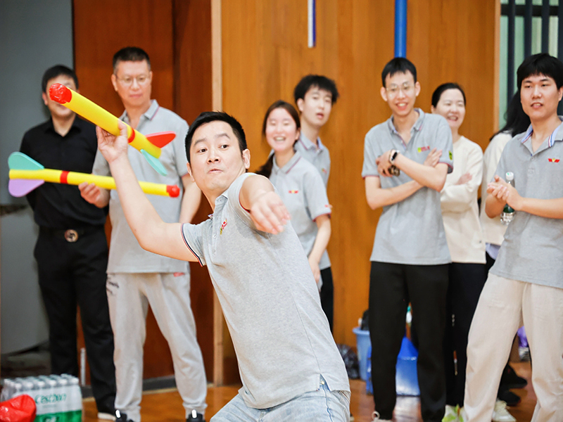 “一飛沖天”項(xiàng)目充滿了挑戰(zhàn)性與刺激性。大家站在起點(diǎn),深吸一口氣,然后猛地發(fā)力,手中的泡沫標(biāo)槍如同展翅的雄鷹般沖向空中。在空中劃過一道優(yōu)美的弧線,周圍的隊(duì)友們一邊為正在比賽的隊(duì)員加油打氣,整個項(xiàng)目現(xiàn)場都洋溢著積極挑戰(zhàn)、超越自我的熱烈氛圍。